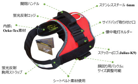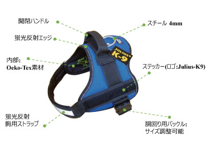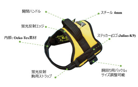 頑丈でスポーティーなデザインに仕上げられており、ヨーロッパの多くの警察犬、消防犬、麻薬操作犬、セキュリティ犬、アジリティクラブ、トレーニングクラブなどで利用されています。オーストラリアの警察はJulius-K9を正式に警察犬に使用する契約をしています。ほとんどの部品はヨーロッパ製で、主にドイツ製です。またトレーニングクラブと提携をし、犬の運動と製品の消耗度を研究し、実用的に使用できるように製造過程で研究しています。各種様々なサイズ・色があるため、小型犬から大型犬まで愛犬のおしゃれ、トレーニングや散歩にご利用いけます。